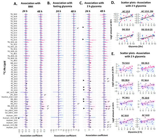 Sex-stratified associations between the amount of 13C-PA lipid (outcome) and maternal glycemia or maternal BMI (predictor). X* represents p < 0.05 in linear regression with males and females combined (not shown). S* represents p < 0.05 in linear regression adjusted for sex (not shown). ► represents significant p < 0.05 for the interaction between sex and maternal glycemia on amount of lipid. Linear regression was then run separately for males and females. Forest plots (A–C) show association coefficient and 95% confidence intervals for males (blue) and females (red) with significance (p < 0.05) shown by dark-colored filled squares. Unadjusted scatter plots illustrating the relationship between 2 h glycemia and amount of lipid for (D) lipids where males and females show similar relationships and for (E) lipids where males and females show different relationships. The Benjamini–Hochberg method was used to correct for multiple testing. Abbreviations: Acylcarn and AC: Acylcarnitine, DG: diacylglycerol, Cer: ceramide, Hex: hexose, LPC: lysophosphatidylcholine, LPE: lysophosphatidylethanolamine, OA: oleic acid, PA: palmitic acid, PC: phosphatidylcholine, PE-P: phosphatidylethanolamine-plasmalogen, TG: triacylglycerols.