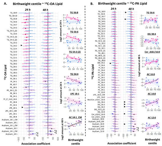 Sex-stratified associations between birthweight centile (outcome) with the amount of placental 13C-OA lipid (A) or 13C-PA lipid (B) after 24 or 48 h of culture. Birthweight centile was standardized for gestational age by local references. X* represents p < 0.05 in linear regression with males and females combined (not shown). S* represents p < 0.05 in linear regression adjusted for sex (not shown). ► represents significant p < 0.05 for the interaction between sex and amount of lipid on birthweight centile. Linear regression was then run separately for males and females (shown in figure). Forest plots (A,B) show association coefficient and 95% confidence intervals for males (blue) and females (red) with significance (p < 0.05) shown by dark-colored filled squares. Unadjusted scatter plots illustrating the relationship between birthweight centile and amount of lipid. The Benjamini–Hochberg method was used to correct for multiple testing. Abbreviations: Acylcarn and AC: Acylcarnitine, DG: diacylglycerol, Cer: ceramide, Hex: hexose, LPC: lysophosphatidylcholine, LPE: lysophosphatidylethanolamine, OA: oleic acid, PA: palmitic acid, PC: phosphatidylcholine, PE-P: phosphatidylethanolamine-plasmalogen, TG: triacylglycerols.