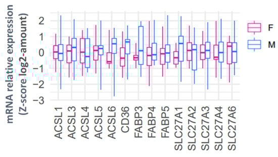 Relative placental mRNA expression of genes involved in fatty acid uptake in females (red) and males (blue). mRNA abundance is normalized to the geometric mean of three housekeeping genes and then log2 transformed and converted to a z-score. Boxes show median and interquartile range while whiskers show minimum and maximum values.