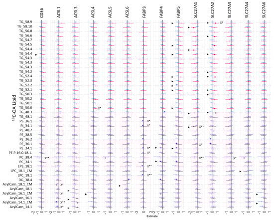 Sex-stratified associations between the amount of 13C-OA lipids (outcome) with relative mRNA abundance after 48 h of culture. Lipid amount was log2 transformed, mRNA abundance was log-2 transformed and z-scored. Linear regression with males and females combined (not shown) with significance p < 0.05 is indicated by X*, whilst significance p < 0.01 is indicated by X**. Interaction between sex*relative mRNA abundance on lipid amount were then investigated with significant interactions p < 0.05 denoted by “►”. Linear regression was then run separately for males and females. Forest plots show association coefficient and 95% confidence intervals for males (blue) and females (red) with significance (p < 0.05 shown by dark-colored filled squares. The Benjamini–Hochberg method was used to correct for multiple testing.
