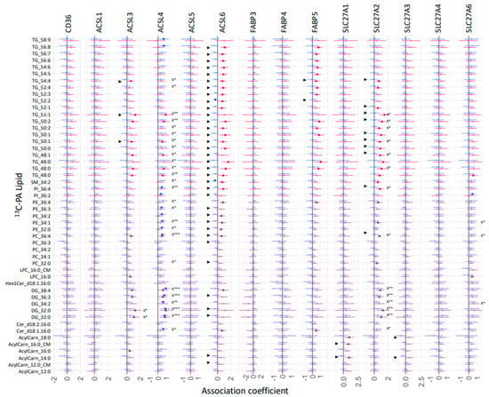 Sex-stratified associations between the amount of 13C-PA lipids (outcome) with relative mRNA abundance after 48 h of culture. Lipid amount was log2 transformed, mRNA abundance was log-2 transformed and z-scored. Linear regression with males and females combined (not shown) with significance p < 0.05 is indicated by X*, whilst significance p < 0.01 or 0.001 is indicated by X** and X***. Interaction between sex and maternal glycemia on lipid amount were then investigated with significant interactions p < 0.05 denoted by “►”. Linear regression was then run separately for males and females. Forest plots show association coefficient and 95% confidence intervals for males (blue) and females (red) with significance (p < 0.05 shown by dark-colored filled circles. The Benjamini–Hochberg method was used to correct for multiple testing.