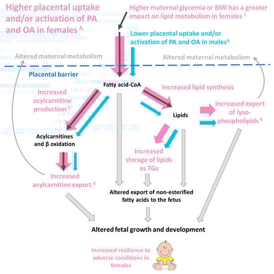 Higher maternal glycemia and BMI are associated with increased maternal plasma lipids, which may increase the risk of fetal macrosomia [,] despite regulation of transplacental lipid transfer by placental lipid transport and metabolism []. Independently of fatty acid supply, maternal glycemia and BMI may also separately influence placental lipid composition to affect pregnancy outcomes in a sex-dependent manner. Maternal obesity is associated with increased placental uptake of radio-labeled OA in females but decreased uptake in males []. However, most placental lipidomic studies to date have not considered sex, making it difficult to explore the extent to which sex-dependent differences in placental lipid metabolism might be implicated in pathophysiological processes.
