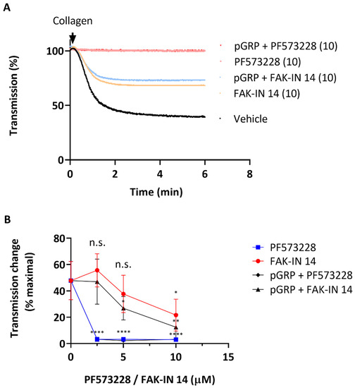 Given the proposed mechanism of GPR56 in shear- and G13α-dependent platelet activation [32], we hypothesized that its role could be masked by integrin αIIbβ3 outside-in signaling, in which the focal adhesion kinase PTK2 plays a central role [17,36,37]. To investigate this, we used two structurally different PTK2 inhibitors, PF573228 and FAK-IN14, of which the former was tested before on human platelets [38,39]. Initial dose-response experiments (2.5–10 μΜ) indicated a more potent effect of PF573228 than of FAK-IN14 on collagen-induced platelet aggregation (Figure 2A,B), which agrees with earlier published IC50 values [38,40]. As expected, under the slowly stirred conditions (1200 rpm providing a low shear rate) in light transmission aggregometry, the addition of pGRP did not further enhance the dose-dependent inhibitory effects of PF573228 or FAK-IN14 on platelet aggregation (Figure 2B).