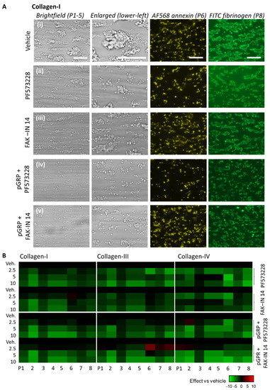 We then examined the combined effect with the GPR56 peptide added. Surprisingly, the combination of pGRP with PF573228 or FAK-IN14 further reduced platelet adhesion and aggregate size on collagen I (Figure 3Aiv,v), as well as collagen III and IV (Figure S3ii,iii). In particular for PF573228, this reduction extended to a lower phosphatidylserine exposure, a marker of GPVI activity. This was also apparent from the subtraction heatmap of Figure 3B, showing larger effect sizes with the combined presence on all surfaces. Cumulative analysis of the scaled parameters confirmed that the reduction with pGRP was highest for PF573228 (Figure S2).