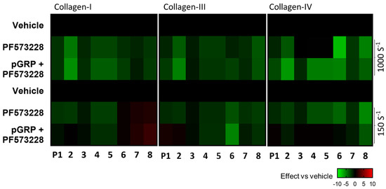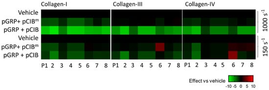To assess shear dependency of these effects, we again evaluated the effects on thrombus formation inhibition of pGRP with/without pCIB or pCIBm at high (1000 s−1) and low (150 s−1) shear rates. The subtraction heatmap pointed to a consistently larger effect of the pGRP + pCIB combination, regardless of parameter and collagen type, at a high shear rate than at a low shear rate (Figure 7). This was confirmed by statistical parameter analysis (Figure S7).