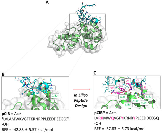 Molecular dynamics simulation of the pCIB–CIB1 complex formation. (A) Reported structure of CIB1 in complex with the pCIB peptide, mimicking part of the intracellular αIIb chain. (B) Calculated structure of the pCIB–CIB1 complex obtained by molecular dynamics simulation. (C) Structure of the modified pCIBm-CIB1 complex by molecular dynamics simulation. Color code: hydrogen bonds shown as yellow dashed lines; amino acid residues of the wildtype (B) and mutated (C) peptides are indicated in cyan and magenta, respectively; CIB1 residues are pictured in green; also indicated per peptide is the calculated binding free energy (BFE).