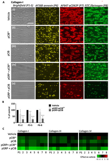 Combined GPR56 and CIB1 peptides affecting collagen-induced thrombus formation. Blood samples were pre-incubated with vehicle medium (control) or indicated peptides pGRP, pCIB, and pCIBm (50 μg/mL each) for 10 min. Thrombus formation on collagen I, III, and IV was monitored. (A) Representative images for collagen I of (i) vehicle control, (ii) pCIBm, (iii) pCIB, and (iv) pGRP + pCIBm, or (v) pGRP + pCIB. Scale bar = 10 μm. (B) Percentual effects of peptides on combined parameters of platelet deposition (P1–2), thrombus characteristics (P3–5), and platelet activation (P6–8) versus the vehicle control condition. Additional images and raw data for collagen III and collagen IV are given in Figures S5 and S6. (C) Subtraction heatmap representing control-subtracted scaled (0–10) parameter values for collagen I, III, and IV microspots. The color code represents a decrease (green) or increase (red) in comparison to controls. Mean values ± SD (n = 3 donors). * p < <0.05, *** p < 0.001, **** p < 0.0001 vs. vehicle (paired Student’s t-test).