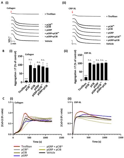 No effect of combined peptides pGRP and pCIB on collagen-induced platelet aggregation or Ca2+ fluxes. (A,B) Platelet preparations (250 × 108/L) were pre-incubated with vehicle control, tirofiban (1 μg/mL) or indicated peptides (50 μg/mL) for 10 min. Platelet aggregation was monitored by light transmission aggregometry in response to 1 μg/mL collagen I or (i) or 1 μg/mL CRP-XL (ii). (A) representative aggregation traces (B) and normalized transmission changes. (C) Fura-2-loaded platelets were pre-incubated with vehicle control, tirofiban (1 μg/mL), or indicated peptides (50 μg/mL) for 10 min, before addition to 96-well plates. After supplementation of 1 mM CaCl2, loaded platelets were automatically stimulated with 10 μg/mL collagen I (i) or 10 μg/mL CRP-XL (ii). Dual wavelength 340/380 nm fluorescence changes per well were recorded in a FlexStation 3. Shown are representative [Ca2+]i traces per agonist. Mean values ± SD (n = 3 donors); n.s., not significant, * p < 0.05, ** p < 0.005, *** p < 0.001, vs. vehicle (paired Student’s t-test).