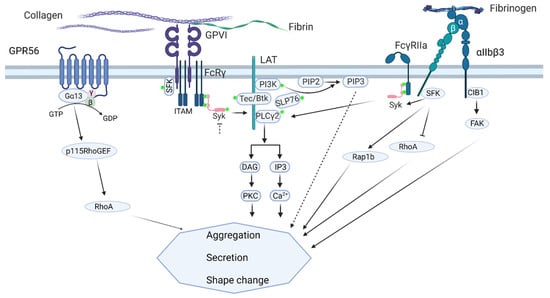 Collagen- and fibrin(ogen)-induced platelet activation and aggregation through glycoprotein VI (GPVI) have been recognized as controlling processes of in vitro and in vivo arterial thrombus formation, with a limited role in hemostasis [1,2,3]. GPVI is an immunoglobin receptor that via the FcR γ-chain co-receptor, when triggered upon ligand binding, causes activation of a signal transduction pathway of protein tyrosine kinases, phosphatidylinositol-3-kinases, and phospholipase Cγ2 (PLCγ2) to evoke granule release and activation of integrin αIIbβ3 [4,5,6]. Fibrinogen is the major ligand for integrin αIIbβ3 to establish platelet aggregation and thrombus formation, in which the integrin can act in a non-redundant way with GPVI [7,8,9].