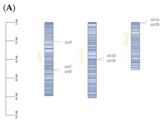 Our study identified seven sst genes of sst1a, sst1b, sst2, sst3a, sst3b, sst5, sst6. Similarly, six sst genes were identified in zebrafish with sst1–sst6, and sst1–sst5 being observed in other teleosts of stickleback (Gasterosteus aculeatus), Japanese medaka (Oryzias latipes), puffer (Takifugu rubripes) and spotted green pufferfish (Tetraodon nigroviridis) []. The sst1, sst2, and sst5 were generated due to two rounds of genome duplications (2R) in early vertebrate evolution [,], therefore we observed conserved sst members of sst1, sst2, and sst5 in both salmonid and non-salmonid species. Previous studies indicated sst3 and sst6 were produced from tandem duplication of sst1 and sst2 [,]. Consistently, we observed sst subtypes were colocalized in chromosome 9 (sst2, sst6), chromosome 15 (sst1b, sst3a), or chromosome 27 (sst1a, sst3b), suggesting they were arranged in tandem repeat. The sst4 is derived from sst1 due to teleost specific genome duplications (or three rounds of genome duplications, 3R) []. However, the sst4 was absent in rainbow trout. The salmonid ancestors experienced an additional round of genome duplication [], and salmonid specific genome duplications (or 4R) probably result in sst4 being lost and generate duplicated sst1 and sst3 duplications. Future studies should be focused on physiology and pharmacology between SST1 and SST4, and between SST1(4) paralogs.