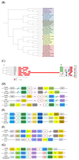 Chromosomal distribution, phylogenetic, syntenic analysis of sst genes in rainbow trout. (A) The chromosomal localization of sst genes. (B) Phylogenetic tree of the SST family in vertebrate. The amino acid sequences were analyzed via a neighbor-joining method with 1000 bootstrap replications. Rainbow trout SSTs are highlighted by a red pentacle. (C) Gene structure and protein motif of SST proteins of rainbow trout. (I) Exon and intron structures of SST proteins in rainbow trout. Phylogenetic tree was constructed by a neighbor-joining method with 1000 bootstrap replications. (II) Protein motif analyses of SST proteins in rainbow trout. Eight specific motifs were found in SST proteins of rainbow trout, different colors represent different motifs. (D–G) Conserved syntenic analyses of sst genes: sst1a/b and sst3a/b (1D); sst2 (1E); sst5 (1F); sst6 (1G). sst genes are shown by the same color. The double slash represents the omission of more than two genes.