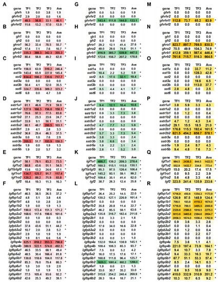 The basal expression of ghrh-sst-gh-igf axis in triploid trout. (A–F) The gene expression of ghrh and receptors (A), gh and receptors (B), sst (C), sstr (D), igf and receptors (E), and igfbps (F) in brain. (G–L) The gene expression of ghrh and receptors (G), gh and receptors (H), sst (I), sstr (J), igf and receptors (K), and igfbps (L) in kidney. (M–R) The gene expression of ghrh and receptors (M), gh and receptors (N), sst (O), sstr (P), igf and receptors (Q), and igfbps (R) in liver. The gene expression levels were generated via counts normalized by DESeq2. The “*” indicates average count > 5.