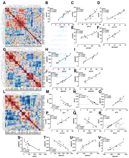 Correlation analysis of ghrh-sst-gh-igf axis in brain, kidney, and liver. (A–F) Heatmap of correlation of ghrh-sst-gh-igf axis in brain (A) and the Pearson correlation coefficient of two genes in brain (B–F). (G–K) Heatmap of correlation of ghrh-sst-gh-igf axis in kidney (G) and the Pearson correlation coefficient of two genes in kidney (H–K). (L–V) Heatmap of correlation of ghrh-sst-gh-igf axis in liver (L) and the Pearson correlation coefficient of two genes in liver (M–V).