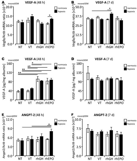 The expression of Vegf-A, its receptors Vegfr-1/2, its co-receptors Angpt-1/2, and Tie-2 was determined by real-time quantitative reverse transcription (RT) polymerase chain reaction (qRT-PCR) as previously described []. Total RNA was extracted by TRIzolTM according to the manufacturer’s protocol (Thermo Fisher Scientific; Schwerte, Germany). Genomic DNA was removed by DNase I treatment prior to complement DNA (cDNA) synthesis. Briefly, 1 μg of RNA was inoculated with 1 U of RNase-free DNase I (Promega; Mannheim, Germany) in a final volume of 10 µL of 1× reaction buffer at room temperature for 15 min. DNase I was inactivated by the addition of ethylenediaminetetraacetic acid (EDTA) and incubation at 65 °C for 15 min. RT was performed with diethylpyrocarbonate (DEPC; Sigma-Aldrich; Taufkirchen, Germany)-treated water, dT16 oligonucleotides (Eurofins MWG Operon; Ebersberg, Germany), and dN6 random hexamer oligonucleotides (Roche Diagnostics; Mannheim, Germany) added to a final concentration of 12.50 and 18.75 ng/µL, respectively, before the reaction mixture was heated to 70 °C for 5 min and then chilled on ice. RT was performed at 37 °C for 1 h in a 1 × transcription buffer containing 0.8 U/µL of recombinant RNasin ribonuclease inhibitor (Promega; Mannheim, Germany), 8 U/µL of Moloney murine leukemia virus (M-MLV) reverse transcriptase (Promega; Mannheim, Germany), 0.48 mM of each dNTP (Thermo Fisher Scientific; Schwerte, Germany), and DEPC-treated water. The quality and concentration of cDNA were assessed by UV–Vis spectroscopy (NanoDrop 2000C; VWR; Erlangen, Germany), adjusted with LiChrosolv water (Sigma-Aldrich; Taufkirchen, Germany) to a final concentration of 200 ng/μL, and stored at −80 °C until required. qRT-PCR was performed using the qPCR Core kit according to the manufacturer’s protocol (Eurogentec; Seraing, Belgium). Briefly, 1 μg of cDNA was assayed in the presence of 0.3–0.9 μM forward primer, 0.3–0.9 μM reverse primer, 0.2 μM of a gene-specific dual-labeled fluorescent probe (Biomers; Ulm, Germany), 3.5–5.0 mM magnesium chloride (MgCl2), 0.2 mM of each dNTP including dUTP, 0.14% (v/v) 6-carboxy-X-rhodamine (ROX), 0.02 U/µL of DNA polymerase, and 0.01 U/µL of Uracil–DNA glycosylase (Eurogentec; Seraing, Belgium). qRT-PCR was performed using a CFX96 Touch Real-Time PCR System (Bio-Rad; Munich, Germany) with the following thermal profile: one cycle at 50 °C for 2 min, followed by 95 °C for 10 min; 50 cycles of 95 °C for 5 s, followed by 60 °C for 1 min. PCR efficiency ranged between 97.9% and 102.0%. Relative target gene expression was calculated in relation to β-actin (Actb) and porphobilinogen deaminase (PBGD/Hmbs) using a PCR efficiency corrected model []. The primers used are listed in Table 1. All samples were assayed in duplicate.
