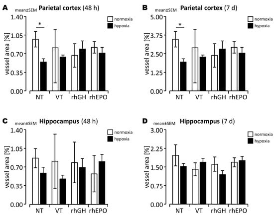 Consistent with our findings, the HIF-dependent VEGF/VEGFR stress response and the increased BBB permeability it causes have been shown to return to physiological levels within 48–72 h post-HI brain injury [,]. In this study, we found that cerebral VEGF-A gene and protein expression and the gene expression of its receptors (Vegfr-1/2) and co-receptors (Angpt-1/2 and Tie-2 system) did not differ significantly between hypoxia-exposed brains and controls after regeneration periods of 48 h and 7 d in neonatal mice. In contrast, our brain-region-specific IHC analysis of vascular–endothelial effects of hypoxia found a decreased mean vessel area in the hypoxic parietal cortex and hippocampal areas of developing brains assessed during the subacute and longer-term periods of regeneration after acute hypoxia. These observations are consistent with previous findings that showed transient endothelial upregulation of VEGF in vessels of the SVZ and periventricular and subcortical white matter regions during a 24–48 h post-HI period in the fetal ovine brain [] and in neonatal rodent stroke models []. In addition, lower vessel density was also observed in the hypoxic developing piglet brain after a reoxygenation period of 72 h []. Moreover, a slight increase in angiogenesis was found in a neonatal rodent stroke model after 48 h of regeneration [] and in our mouse model of acute global brain hypoxia after 72 h of regeneration []. Therefore, different species, hypoxia models, regions of interest, and region-specific regulation may explain variable observations on cerebral VEGF-A regulation and angiogenesis during the post-hypoxic repair period.