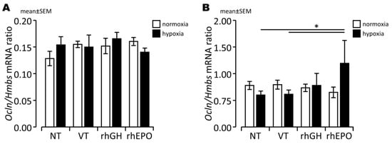 Gene expression of Ocln relative to PBGD in normoxic and hypoxic brains of neonatal mice with and without rhGH and rhEPO treatment after a regeneration period of 48 h (A) or 7 d (B). *, p < 0.05.