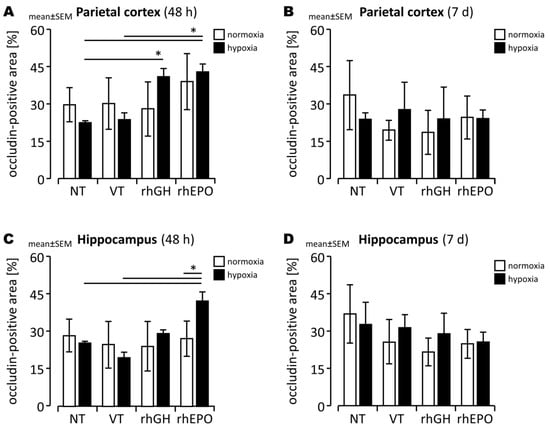 Quantification of OCLN+ area by immunofluorescence analysis of OCLN and PECAM-1 protein in normoxic and hypoxic developing mouse brains with and without rhGH and rhEPO treatment after a regeneration period of 48 h (A,C) and 7 d (B,D) in the parietal cortex (A,B) and hippocampus (C,D). Data are presented as mean ± SEM. *, p < 0.05.