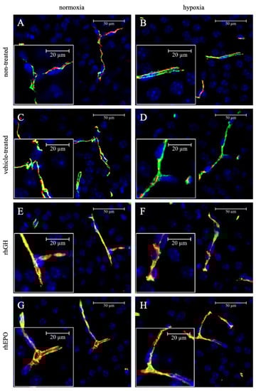 Representative photomicrographs of PECAM-1 (green) and OCLN (red) protein co-staining of vascular endothelial cells in hypoxic developing mouse brains (B,D,F,H) compared to normoxic controls (A,C,E,F) after a 48 h regeneration period in NT (A,B), VT (C,D), rhGH- (E,F), and rhEPO-treated brains (G,H) in the parietal cortex. Blue, 4′,6-diamidino-2-phenylindole (DAPI) nuclear counterstain.