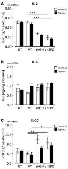 Protein levels of (A) IL-2, (B) IL-6, and (C) IL-10 in normoxic and hypoxic mouse brains after a 48 h regeneration period. *, p < 0.05; **, p < 0.01; ***, p < 0.001.