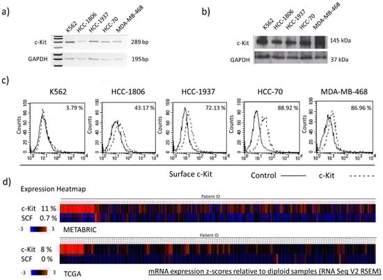 - Ulivi, O.; Zoli, W.; Medri, L.; Amadori, D.; Saragoni, L.; Barbanti, F.; Calistri, D.; Silvestrini, R. c-Kit and SCF expression in normal and tumor breast tissue. Breast Cancer Res. Treat. 2004, 83, 33–42. [Google Scholar] [CrossRef] [PubMed]
