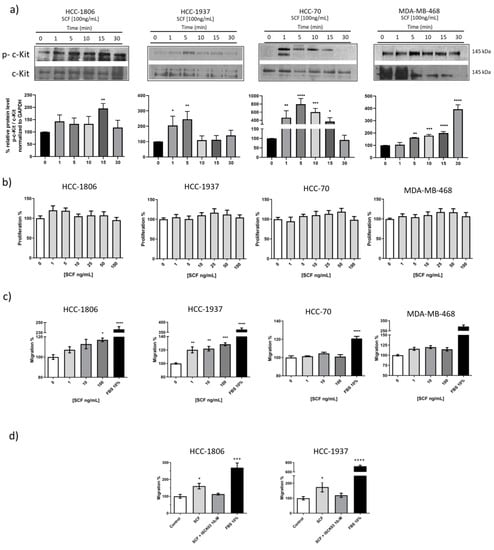 2.2. SCF Induces Activation of c-Kit in TNBC Cells and Promotes Cell Migration