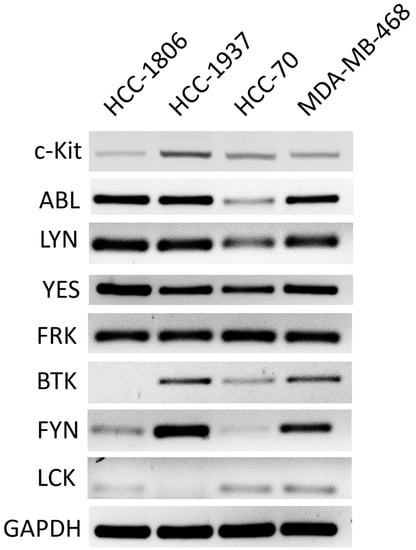 | Tyrosine Kinase | Forward 5′-3′ | Reverse 5′-3′ | Annealing Temperature (°C) | Reference |