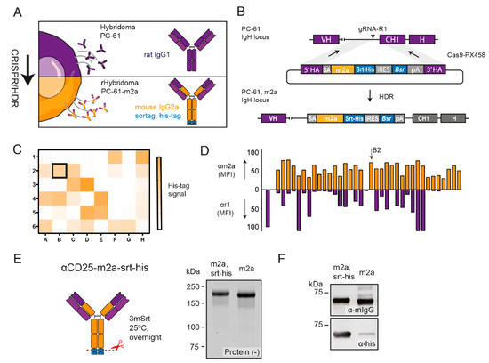 - Van Der Schoot, J.M.S.; Fennemann, F.L.; Valente, M.; Dolen, Y.; Hagemans, I.M.; Becker, A.M.D.; Le Gall, C.M.; Van Dalen, D.; Cevirgel, A.; Van Bruggen, J.A.C.; et al. Functional Diversification of Hybridoma-Produced Antibodies by CRISPR/HDR Genomic Engineering. Sci. Adv. 2019, 5, eaaw1822. [Google Scholar] [CrossRef] [Green Version]