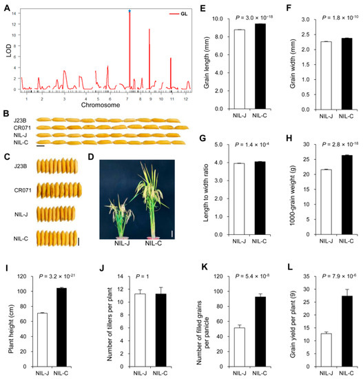 Two NIL plants carrying the homozygous J23B allele glw7.1 and CR071 allele GLW7.1 were developed and named as NIL-J and NIL-C, respectively. Compared to NIL-J, NIL-C displayed a higher value in grain length (increased by 8%) (Figure 1B,E) and grain width (increased by 5%) (Figure 1C,F), leading to an increase in length-to-width ratio by 2% (Figure 1G) and 1000-grain weight by 22% (Figure 1H). The plant height of NIL-C was about 33 cm higher than that of NIL-J (Figure 1D,I), but no difference was observed in tiller numbers per plant (Figure 1J). Meanwhile, NIL-C displayed more filled grains per panicle (increased by 80%) than NIL-J (Figure 1K). Thus, the increase in grain weight and grain number contributed to the increase in grain yield per plant by 114% in NIL-C, in comparison with NIL-J (Figure 1L).