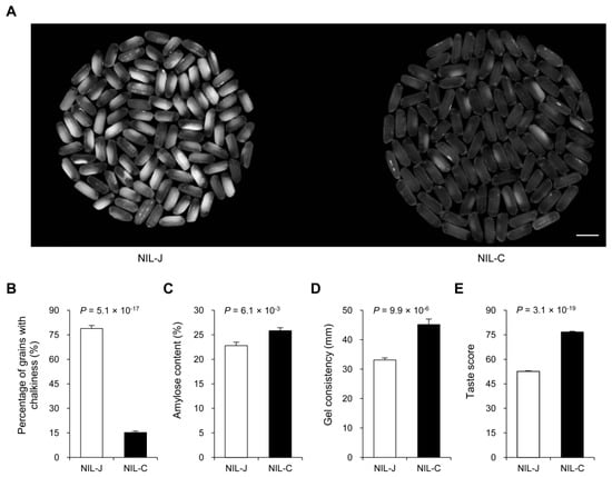 The effects of the GLW7.1 allele on the physicochemical characteristics of milled rice. (A) Comparisons of chalkiness and endosperm transparency of milled rice between the GLW7.1 NILs (n = 100). Scale bar: 1 cm. (B) Percentage of grains with chalkiness. (C) Amylose content. (D) Gel consistency. (E) Taste score. All phenotypic data in (B–E) were measured from paddy-grown NIL plants grown under normal cultivation conditions. Data are represented as mean ± s.e.m. (n = 10). The Student’s t-test was used to produce p values.