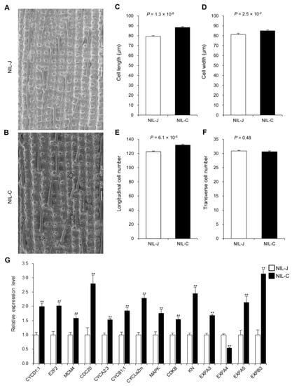 The glume, including lemma and palea, determines the upper limit of grain size [39,46,48,49], and its size is determined by cell number and cell size. To uncover the cytological reason underlying the difference in grain size between NIL-J and NIL-C, we performed scanning electron microscopic analysis of the outer surfaces of lemmas (Figure 3A,B). Compared with NIL-J, the value of cell length, cell width and the number of longitudinal cells were significantly higher in NIL-C (Figure 3C–E), but the number of transverse cells showed no difference (Figure 3F). To further investigate how GLW7.1 regulates cell number and cell size, we examined the expression levels of 43 genes involved in cell cycle and cell expansion using the young panicles (8–10 cm in length) of the two NILs. As expected, expression levels of 10 cell cycle related-genes (CYCD1;1, E2F, MCM4, CDC20, CYCA2;3, CYCB1;1, CYClaZm, MAPK, CDKB and KN) and 3 cell-expansion-related genes (EXPA3, EXPA5 and EXPB3) were significantly up-regulated (fold-change > 1.5 and p < 0.01) in NIL-C (Figure 3G, Table S2). These results suggest that GLW7.1 positively regulates grain size by promoting cell division and cell expansion to increase cell number and cell size of the glume during spikelet development.