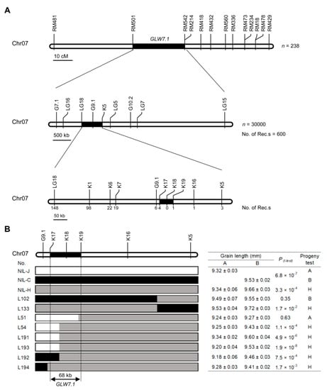 To fine-map GLW7.1, we developed a random population consisting of 30,000 individuals from NIL-H lines (NIL plants with heterozygous allele GLW7.1/glw7.1) and screened recombinants in the target region using two newly developed markers (G7.1 and LG15). A total of 600 recombinants were identified, and further genotyping was conducted using 16 newly developed simple sequence repeats (SSR) and kompetitive allele-specific PCR (KASP) markers (Figure 4A, Table S1). The grain size of the 600 recombinants and 70 non-recombinants derived from the random population was investigated, and GLW7.1 was mapped to the interval between LG18 and K5 by a subsequent QTL analysis (Figure S3A). Subsequently, we performed a progeny test by investigating the grain size of homozygous progenies derived from each recombinant, and three non-recombinant lines (NIL-J, NIL-C and NIL-H) were designated as controls. In the end, the GLW7.1 locus was narrowed to the region between markers K17 and K19 (Figure 4B and Figure S3B).