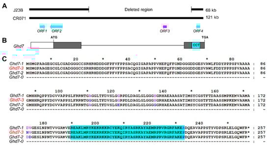 Candidate gene of GLW7.1. (A) A deletion of 53 kb was detected in J23B compared with CR071, which included the candidate gene of GLW7.1 (the arrow symbol in magenta), while no variation was detected in the protein-coding regions of the other three ORFs (arrow symbols in cyan) and their corresponding promoter regions. (B) ORF3 encodes the CCT motif family protein, GHD7. CCT domain is indicated in the cyan box. (C) The protein sequences of GHD7 for four Ghd7 alleles. CR071 carried Ghd7-3 allele of Ghd7 compared with Minghui 63 (Ghd7-1), Nipponbare (Ghd7-2) and J23B (Ghd7-0). CCT domain (aa. 190–233) is indicated with cyan background. Polymorphic amino acids are indicated by different colors using the amino acids sequence of Ghd7-1 allele as reference. Asterisks above amino acid sequences indicate positions of amino acids (10, 30, 50, 70, 90, 110, 130, 150, 170, 190, 210, 230 and 250) and asterisks within amino acid sequences indicate stop codons.