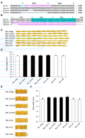 To determine whether the Ghd7-3 allele underlies the QTL GLW7.1, we conducted a knockout experiment by editing the allele using the CRISPR-Cas9 system in the background of NIL-C. The sequence (c. 512 TGGCCAATGTTGGGGAGAGC) in the second exon was designed as the sgRNA target site to produce mutations neighboring the CCT domain coding region (Figure 6A). Three mutated alleles were obtained, named A1, A4 and A8. The allele A4 showed minor amino acids change (AN → D) and still retained the CCT domain. By contrast, both 1 bp insertion in allele A1 and 20 bp deletion in allele A8 resulted in frameshift mutations, which caused the loss of the CCT domain (Figure 6B). As expected, the alleles A1 and A8 produced smaller grains than the allele A4 in the NIL-C background (Figure 6C–F). We also conducted a complementation experiment by expressing the cDNA of the Ghd7-3 allele driven by its native promoter in the NIL-J background. The grains produced from the complemented lines Com1, Com2 and Com3 were larger than those from negative transgenic plants NIL-J-Neg (Figure 6C–F). Additionally, the other two alleles of Ghd7 (Ghd7-1 and Ghd7-2) could also increase grain size in the Zhenshan97 background (Figure S4). Together, these data indicate that Ghd7-3 is the functional gene underlying GLW7.1.