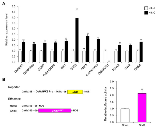 To explore the downstream genes of GLW7.1 in regulating grain size, we detected the expression levels of 63 grain-size genes in NIL-J and NIL-C by qRT-PCR analysis using the young panicles (8–10 cm in length). The GLW7.1 locus significantly up-regulated the expression of nine positive grain-size genes (fold-change > 1.5 and p < 0.01), including genes encoding OsBZR1 (BES1/BZR1 homolog protein) [59], OsMAPK6 [15], GLW7 [31], OsbHLH107 [35], IDEAL PLANT ARCHITECTURE 1 (IPA1) [60], SRS3 (a kinesin motor domain protein) [61], SMALL AND ROUND SEED 5 (SRS5) (alpha-tubulin protein) [62] and OsWRKY53 [19] (Figure 9A). Furthermore, we observed an extremely significant down-regulation of OsMADS1 (fold-change = 56.7 and p = 6.1 × 10−7), which negatively regulates grain length [9] (Figure 9A). Furthermore, transcription activation assay in rice protoplasts prepared from leaf sheath of Zhenshan97 seedlings shown that the LUC activity driven by the OsMAPK6 promoter was significantly induced by GHD7 (Figure 9B), which indicates that GHD7 could directly activate the expression of OsMAPK6. Overall, these results suggest that GLW7.1 positively regulates grain size through a series of grain-size genes.