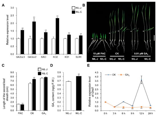 The germinated seeds of NIL-J and NIL-C were grown in a nutrient solution that contained various concentrations of GA3 (Sangon Biotech, A600738, Wuhan, China) or 10 μM Paclobutrazol (Sangon Biotech, A630332, Wuhan, China) and incubated at 28 °C under 13 h light/11 h dark conditions. After 10 days, the length of the second leaf sheaths was measured.