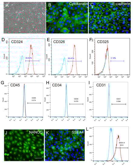 hAESCs were generated from primary amniotic epithelial cell culture. As reported in our previous studies [,], hAESCs displayed the typical cobblestone–like appearance of epithelial cells (Figure 1A) and showed high expression of pan–Cytokeratin (Figure 1B), E–cadherin (CD324) (Figure 1C,D), and Epcam (CD326) (Figure 1E), the specific markers of epithelial cells. hAESCs were negative for the epithelial–mesenchymal transition marker N–cadherin (CD325) (Figure 1F), the hematopoietic lineage markers CD45, CD34 (Figure 1G,H), and the endothelial marker CD31 (Figure 1I). Moreover, expression of the pluripotent markers NANOG and SSEA4 supported the plasticity of hAESCs as seed cells (Figure 1J–L).