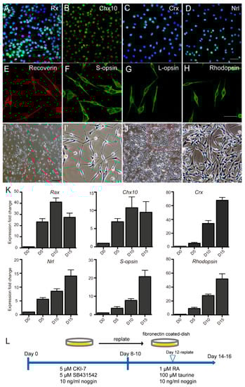 - Osakada, F.; Jin, Z.B.; Hirami, Y.; Ikeda, H.; Danjyo, T.; Watanabe, K.; Sasai, Y.; Takahashi, M. In vitro differentiation of retinal cells from human pluripotent stem cells by small–molecule induction. J. Cell Sci. 2009, 122, 3169–3179. [Google Scholar] [CrossRef] [Green Version]