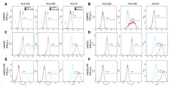 As a major concern in cell therapy is graft rejection, the immunogenicity of the differentiated cells was detected before subretinal transplantation. HLA–II molecules (–DR, –DQ, and –DP) contribute fundamentally to immune recognition and rejection during allograft, especially HLA–DR and HLA–DQ, because of their high polymorphism. On the other side, the non–classic HLA–G molecule plays a critical role in the maternal immune accommodation and may create an immune–tolerogenic environment to improve the survival of allografts after transplantation by modulating the immune response of regulatory T cells and NK cells []. The flow cytometry results demonstrated that significant expression of HLA–DR was detected in IFN–γ–treated human umbilical cord mesenchymal stem cells (hUMSCs), whereas a very low level of HLA–G was detected in hUMSCs (Figure 3A,B). Similar to what was detected in hAESCs (Figure 3C,D), the levels of HLA–DR and HLA–DQ were very low, and the expression of HLA–G was high in hAESCs–PR–like cells, regardless of IFN–γ treatment, which ensures the long–term survival of the differentiated cells within the host retina (Figure 3E,F).