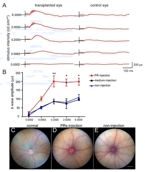 Subretinal transplantation of hAESCs–PR–like cells showed partially functional rescue in RCS rats. (A) Representative ERG responses in a transplantation eye and its fellow control eye. (B) Mean b–wave amplitudes at different intensity showing a similar preservation pattern compared to groups of control eyes, n = 4 per group. (C–E) Representative color fundus images of normal rat eye, hAESCs–PR–like injection eye of RCS rat, and non–injection eye of RCS rat. 2 mm in (C–E). Error bars represent mean ± SEM. * p < 0.05, ** p < 0.01; two–way ANOVA followed by Tukey’s multiple comparisons test.