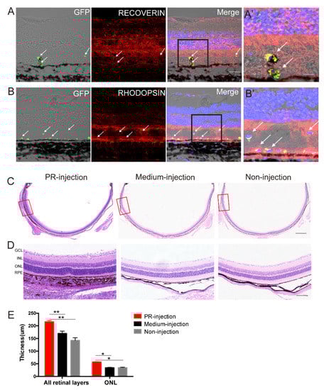 - Singh, M.S.; Issa, P.C.; Butler, R.; Martin, C.; Lipinski, D.M.; Sekaran, S.; Barnard, A.R.; MacLaren, R.E. Reversal of end–stage retinal degeneration and restoration of visual function by photoreceptor transplantation. Proc. Natl. Acad. Sci. USA 2013, 110, 1101–1106. [Google Scholar] [CrossRef] [Green Version]