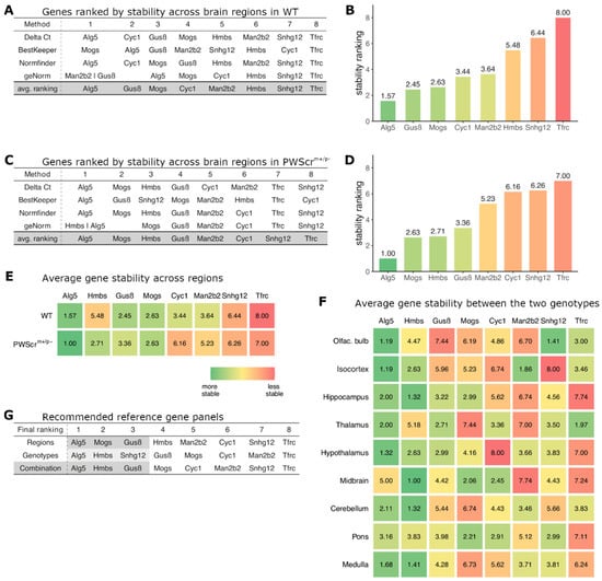Identification of the reference gene panel. (A,C) Expression stability ranking across nine brain regions of reference gene candidates in WT and PWScrm+/p− mice, respectively, determined by four different stability ranking methods. Avg. ranking: shows the calculation of the resulting average ranking of the candidate genes (highlighted in gray; bottom row). (B,D) Average ranking position of each of the genes (lower average rank/green is more stable than higher average rank/red) across the nine brain regions of WT (B) and PWScrm+/p− (D) mice, respectively. (E) Average expression stability ranking positions of gene candidates across the nine brain regions in WT (top) and PWScrm+/p− (bottom) mice. (F) Average ranking of expression stability between the two genotypes (WT and PWScrm+/p−) within each of the nine brain regions for the reference gene candidates. (G) Compilation of reference gene panel. Regions: average ranking of genes for expression stability within regions of genotypes; genotypes: average ranking of expression stability across investigated genotypes within each brain region; combination: recommended panel of reference genes, i.e., the three highest ranked genes, highlighted in gray.