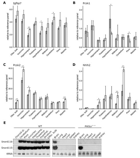 Expression analysis of Pcsk1, Pcsk2, Igfbp7 and Nhlh2. (A) Comparative expression analysis of Igfbp7, (B) Pcsk1, (C) Pcsk2, and (D) Nhlh2 genes relative to reference gene panel in nine brain regions of male mice P28 (WT in gray, PWScrm+/p− in white). Mean ± SD of three biological replicates (six for WT hypothalamus); * p ≤ 0.05, ** p ≤ 0.01, unpaired two-samples t-test. (E) Northern blot hybridization analysis of Snord116 and Snord115 expression in brain areas and tissues of WT mice (left and middle panels, respectively); and PWScrm+/p− (right panel) animals. As a loading control, tRNAs (negative image of an ethidium bromide-stained gel) is shown at the bottom.