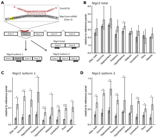Phylogenetic analysis of the conserved Snord116 RNA guide sequence (called ASE—antisense element) revealed sequence complementarity to the exonic regions of several mRNAs. Among the possible candidates is alternatively spliced exon 3 of Neurolignin 3 (Nlgn3) pre-mRNA (Figure 4A). The Snord116 targeting region on Nlgn3 is evolutionary conserved in mammals, including humans and mice, and located in close proximity to the intron 2–exon 3 junction, overlapping a predicted exon splice enhancer. The hybridization energy of the Snord116–Nlgn3 base–pair interaction is about −20 kcal/mol, which is similar to that of regular C/D Box snoRNA-rRNA targeting []. In humans, the NLGN3 gene undergoes posttranscriptional regulation during alternative splicing resulting in several different mRNA isoforms, at least two of which contain exon 3 []. Murine Nlgn3 pre-mRNA is processed in a similar manner. The UCSC Genome Browser on Mouse (GRCm39/mm39) annotates three potential splice isoforms and among them, only one contains exon 3. Interestingly, the NLGN3 splice isoform-dependent regulation of synaptic transmission in the hippocampus has been shown []. Recently, it was reported that Snord116 could regulate alternative splicing and increase the abundance of NLGN3 isoforms that contain exon three []. The experiments were performed in a human HeLa S3 cell line-based Snord116 knock-down system, where the Snord116 level was reduced by about 50%, using specific antisense oligonucleotides [].