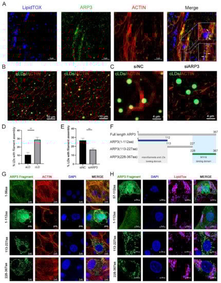 ARP3 is a conserved microfilament protein of the actin-related protein family whose main function is to promote nucleation and assembly of microfilaments and facilitate cell migration [34,35]. The binding and movement of LDs to microfilaments increases lipid consumption, and when the binding is inhibited, LDs show reduced consumption and localized fusion of small LDs in the cell. In our study, we identified the 1-112aa region of Arp3 as the binding domain of LDs and microfilaments, where 1-56aa showed high agreement with microfilament localization. Interestingly, 57-112aa did not show a stronger LD binding ability and needs to be studied more precisely (Figure 1G,H).