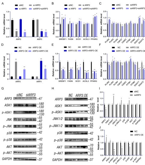 To understand the molecular mechanism by which ARP2/3 regulates lipid metabolism, we measured the ASK1-p38-JNK and AKT signaling pathways. The results showed that the p-ASK1, p-p38, and p-JNK1/2 levels were increased when ARP2 or 3 were knocked down (Figure 2G,I), and the p-AKT level also increased. As expected, the phosphorylation levels of all these proteins were significantly reduced when ARP2/3 was over-expressed (Figure 2H,J). These results indicated that ARP2 and ARP3 regulate the ASK1-p38-JNK and AKT signaling pathways to modulate lipid metabolism.