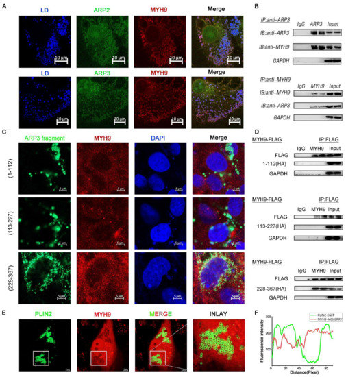MYH9 interacted with ARP3 for LD movement. (A) Subcellular localization of ARP2 or ARP3 and MYH9, bar, 10 μm (B) The binding of ARP3 and MYH9 detected by co-immunoprecipitation. (C) Subcellular localization of ARP3 truncation fragments and MYH9, bar, 5 μm. (D) The binding of ARP3 truncation fragments and MYH9 detected by co-immunoprecipitation. (E) Subcellular localization of Plin2 and MYH9, bar, 5 μm. (F) The Fluorescence intensity analysis of (E).