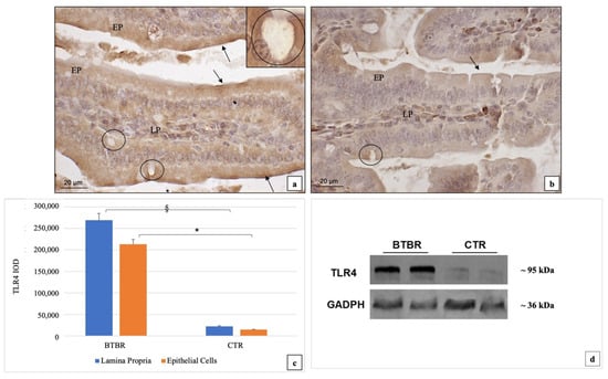 Representative images of TLR4 immunostaining in GI samples of BTBR (a) and CTR mice (b); 200×. The immunohistochemical signal (marked in brown) could be identified in the cytoplasm both in the EP and in the LP cells. The positivity is mainly evident in the brush border membranes of the EP cells (highlighted by a black arrow). The goblet cells were negative both in BTBR and in CTR mice; they are illustrated in the insert of (a) (1000×). Statistical analyses of TLR-4′s levels both for LP and EP in BTBR and CTR animals are reported in graphic in (c). Data obtained by Western blot showing TLR4 levels in BTBR and CTR small intestines are reported in (d). Data are presented as mean ± SD. * p < 0.05 TLR4 immunopositivity in EP, BTBR vs. CTR mice; § p < 0.05 TLR4 immunopositivity in LP, BTBR vs. CTR mice. LP: Lamina propria; EP: epithelial cells; black circles: goblet cells; black arrows: brush border membranes. The number of animals was 10 for BTBR and 10 for CTR; moreover, 3 samples for each animal were used. The images are a representative sample of all the examined tissues.