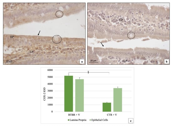 If we compare BTBR and CTR mice, COX-2 immunostaining was significantly up-regulated in the LP cells (p < 0.05) (Figure 4a) in the BTBR mice, but if we consider EP cells, COX-2 positivity was not significatively higher (p > 0.05) in either of the two groups (Figure 4a,b). The quantitative evaluations confirming the semiquantitative analysis and the results are reported in Figure 4c.