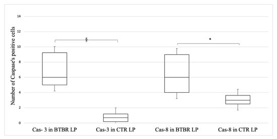 Quantification of Cas-3 and Cas-8 positive cells in the lamina propria (LP) of both BTBR and CTR mice. Data are presented as mean ± SD. § p < 0.05 number of Cas-3 positive cells, BTBR vs. CTR mice; * p < 0.05 number of Cas-8 positive cells, BTBR vs. CTR mice. The number of animals was 10 for BTBR and 10 for CTR and 3 samples for each animal were used. The images are a representative sample of all examined tissues.