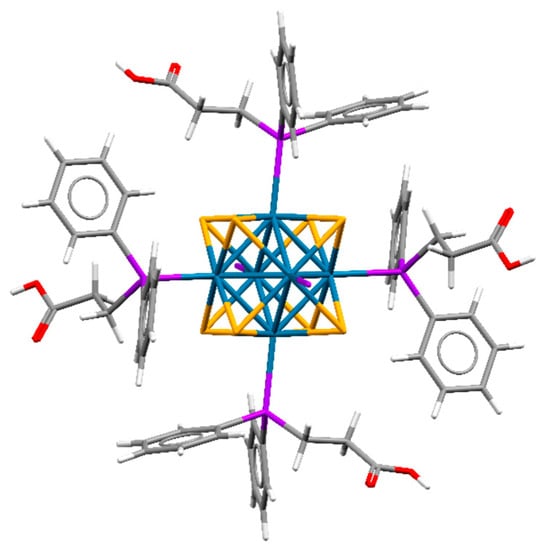 Structure of neutral cluster complexes [{W6Q8}(PPh2C2H4COOH)6]. Two phosphine ligands are omitted for clarity. W—blue, Q—orange, P—purple, C—grey, H—white, O—red.